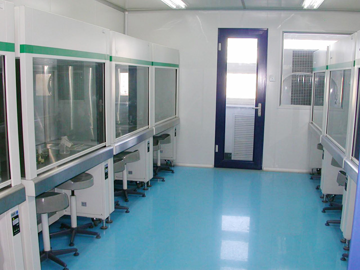 彩鋼板包柱、包箱,裝陰陽R角,要求所有陽角、陰角采用圓角過渡,杜絕細菌寄生。在凈化區(qū)內的柱子用彩鋼板另包起來有利于節(jié)約材料和統(tǒng)一陰陽R角。安裝時,所有圓弧線的頂頭必須加工圓弧堵頭封死,陰陽R角均為50圓弧鋁材。在凈化區(qū)內,凡是有可能影響潔凈度,如彩鋼板之間的拼接縫、R角與壁板、頂板的所有縫隙、空調風管、風口、過濾器與壁頂板間的縫隙、電氣穿過壁板頂板的保護管槽與洞口邊緣間的縫隙、所有開關插座燈具與彩鋼板頂板面間的縫隙、所有給排水工藝、保護管與洞口及玻璃與框間的縫隙,均要密封處理。密封硅膠應在彩鋼板安裝基本就緒,衛(wèi)生條件較好,經過徹底清掃除塵后,統(tǒng)一進行。實驗室各連接處不得有泄漏。